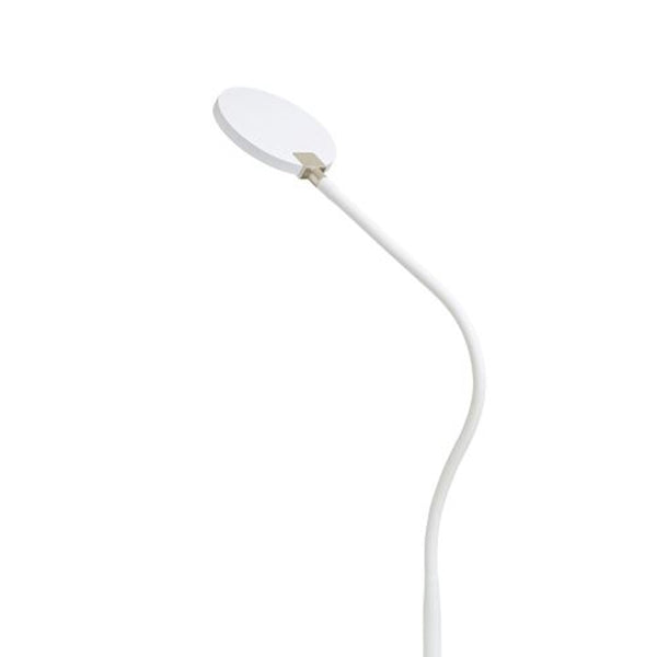 Dimmbare LED-Stehlampe mit flexiblem Hals und rundem Strahler mit mattem Diffusor für diffuses Licht. Die Steuerung befindet sich am Ständer.