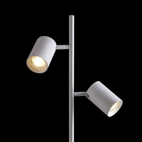 Designer Stehlampe aus Chrom mit zwei schwarzen LED-Schiebestrahlern, die einzeln über Schalter an roten Stromkabeln gesteuert werden. Beide Kabel sind mit Steckadaptern beendet.