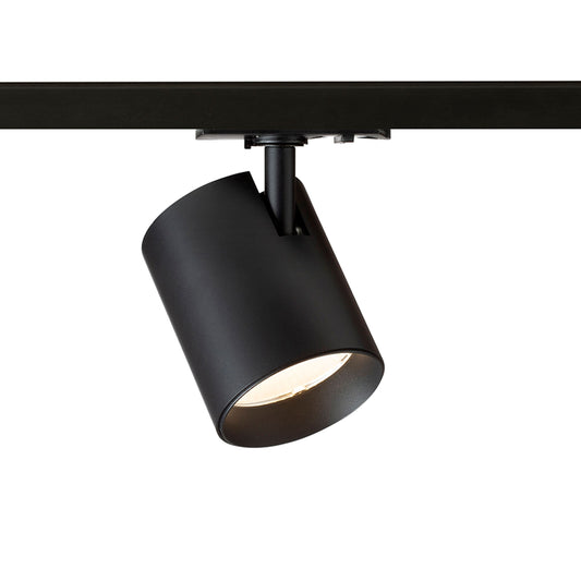 Dimmbares zylinderförmiges Leuchtmittel für 3-Phasen Stromschiene mit einstellbarem Lichtkegel über ein Zoom-System (10–60°). Die Farbtemperatur kann über einen Schalter am Leuchtmittel auf 3000K, 4000K oder 5000K eingestellt werden. Dimmbar über TRIAC.