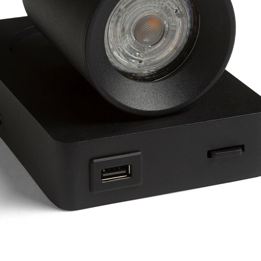 Lackierte Wandleuchte mit einer ausrichtbaren GU10-Lichtquelle und integriertem USB-Anschluss, geeignet zum Aufladen von Smartphones oder ähnlichen Geräten.