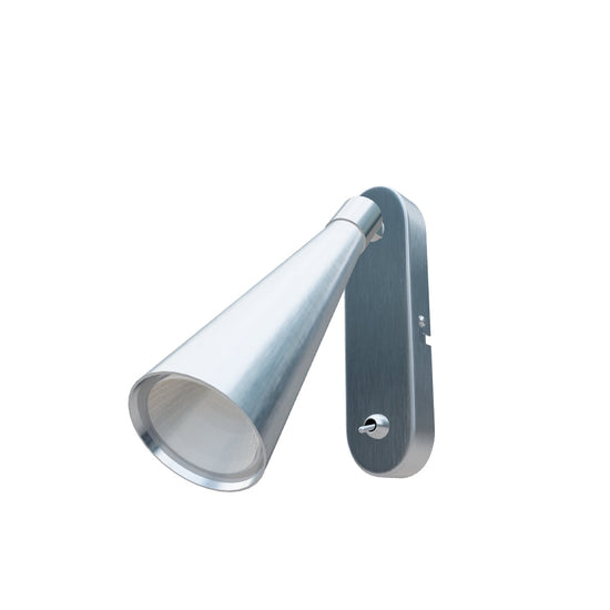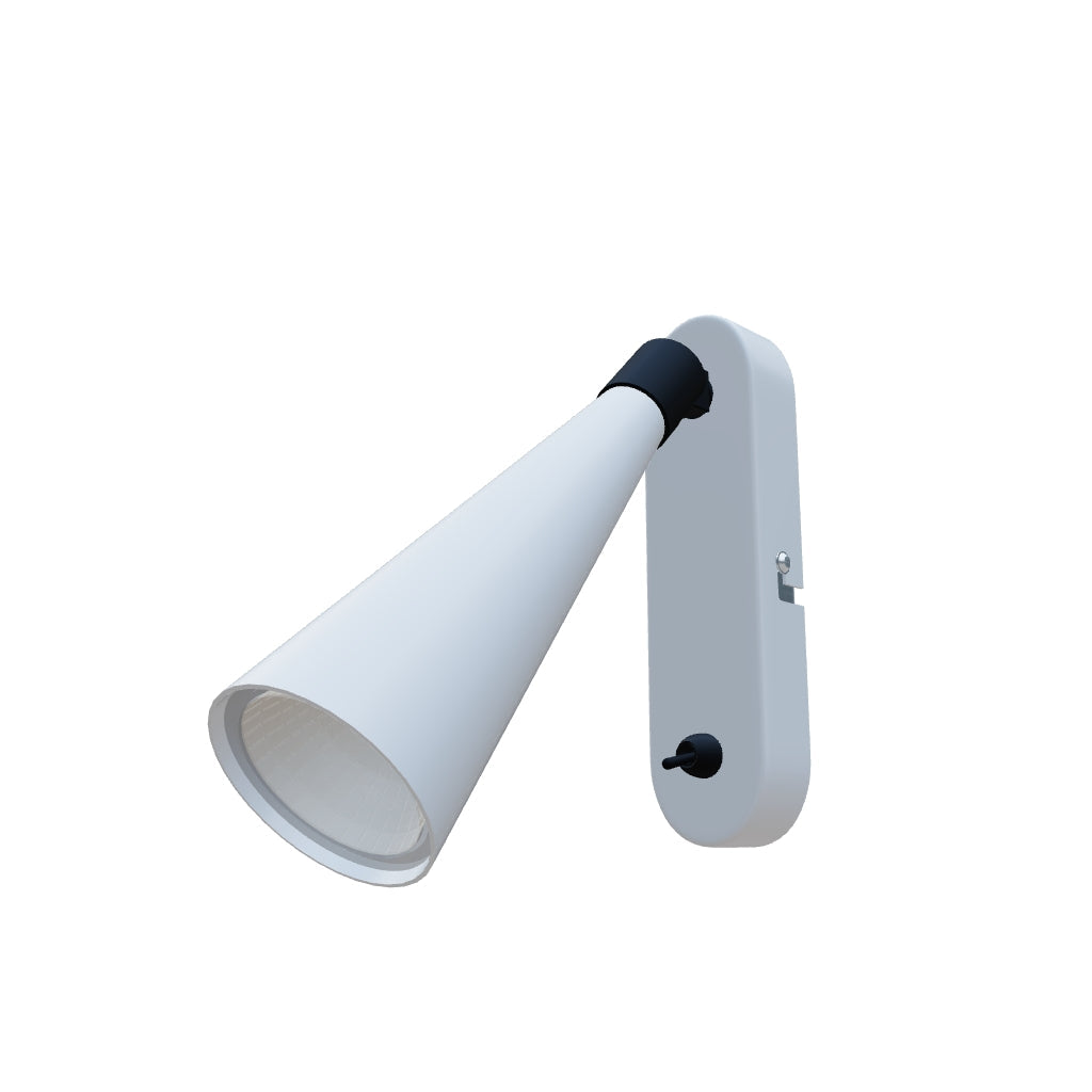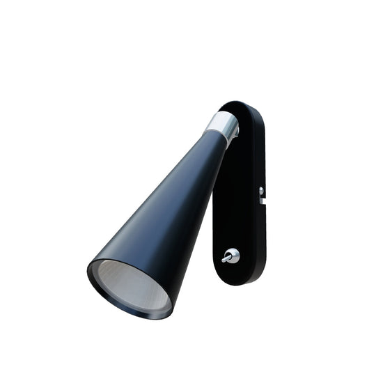 Wandleuchte mit konischem Reflektor für LED-Glühbirne mit GU10-Sockel, Hebelschalter befindet sich am Sockel.