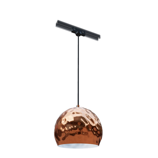 Pendelleuchte mit gepresstem Metallschirm. Die Außenseite des Schirms ist aus Kupfer, die Innenseite ist weiß lackiert. Schwarzes PVC Kabel mit Adapter in eine 3-Phasen-Schiene.