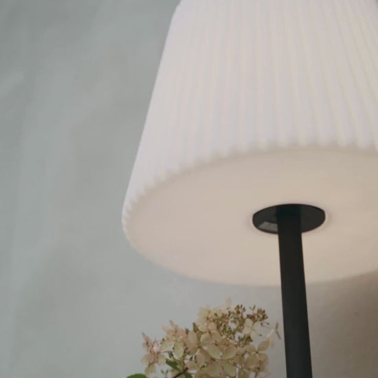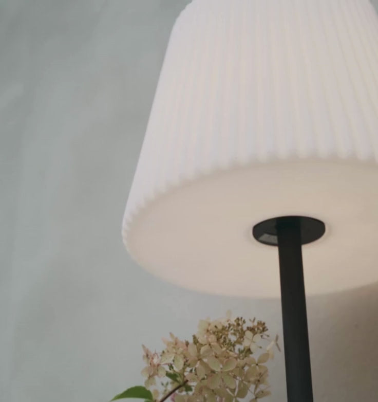Stehlampe mit Kunststoffschirm. Das Netzkabel ist mit einem Sicherheitsstecker abgeschlossen.