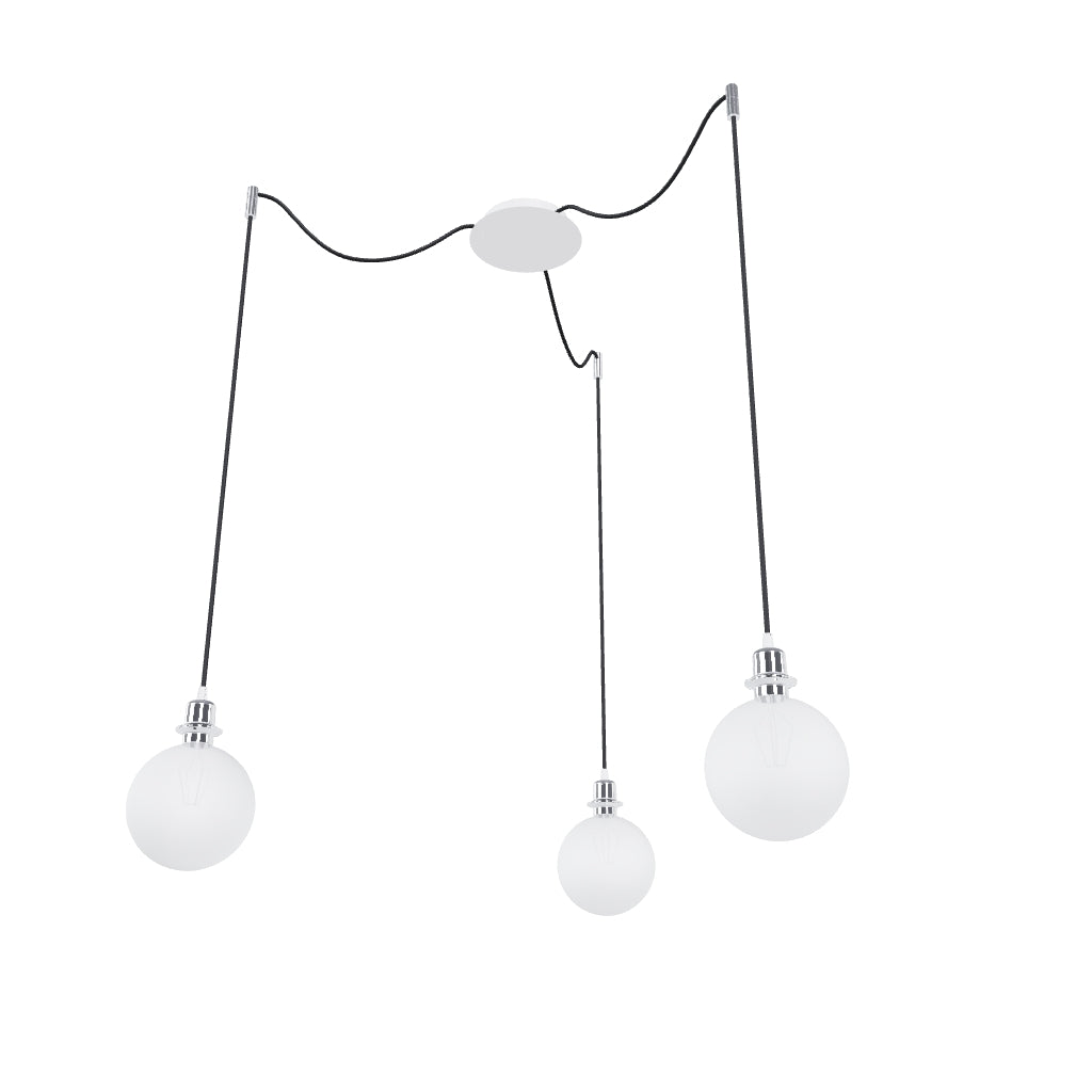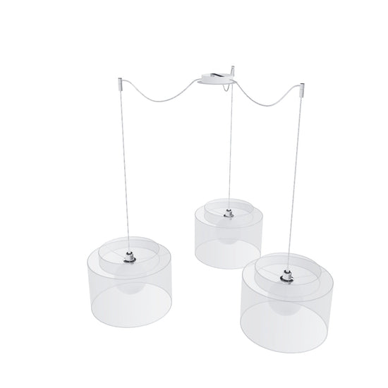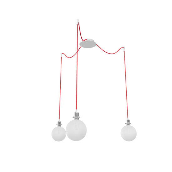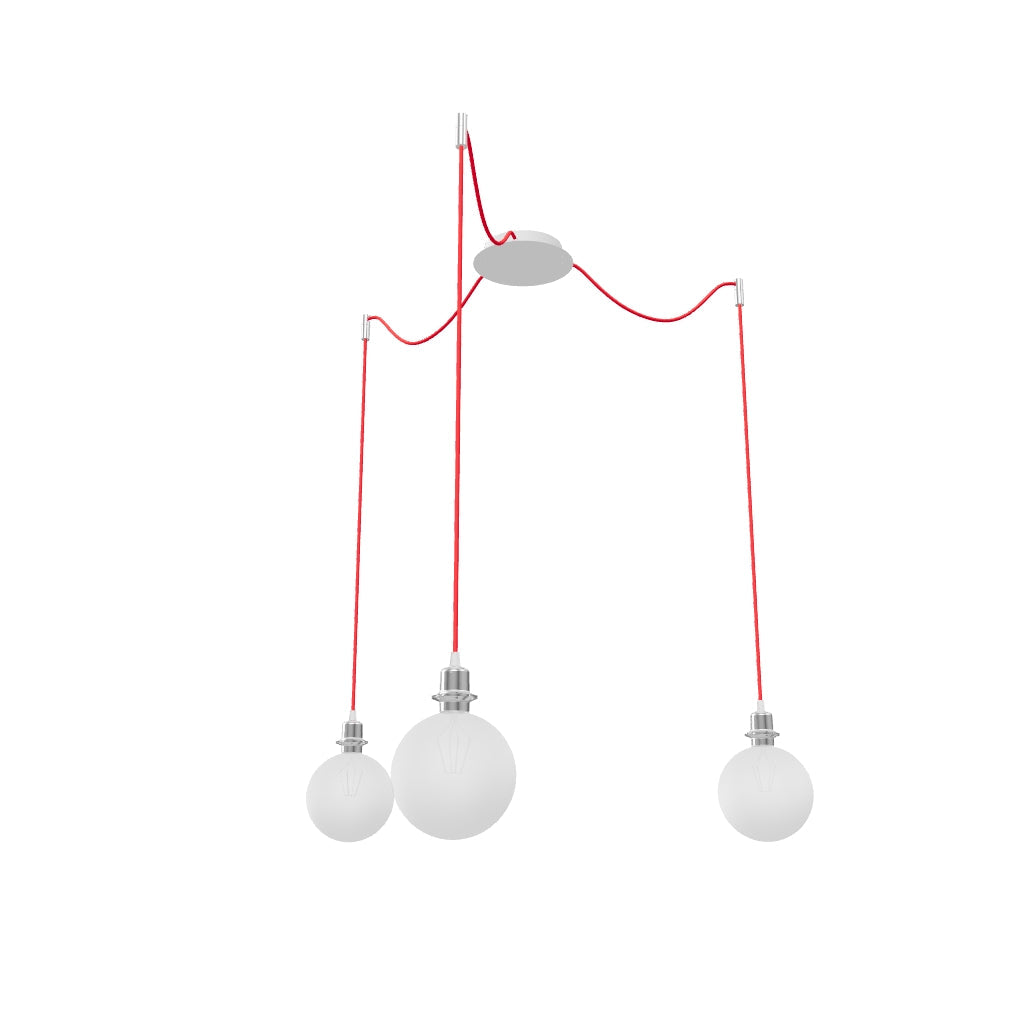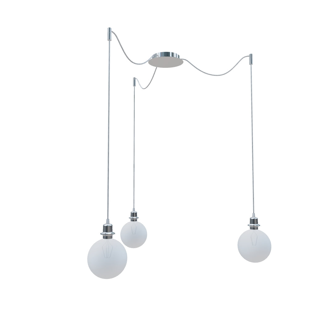 Pendelleuchte mit zentraler Deckenbasis und drei Textilsarmen mit Metallsockel zur Deckenbefestigung, E27-Fassung zur Verwendung mit geeigneten Textilschirmen. Das Stoff-Pendelset wird mit vechromten Deckenhaltern geliefert, die in einem individuellen Abstand von der Basis installiert werden können. Kabellänge 3 m. Für Schirme: ARISTA, DELI, JAKARANDA, DOUBLE 40/30, DOUBLE 55/30, ASPRO 40/30, ASPRO 55/30, RON 15/20, RON 40/25, RON 55/30, TEMPO 15/30, TEMPO 30/19.