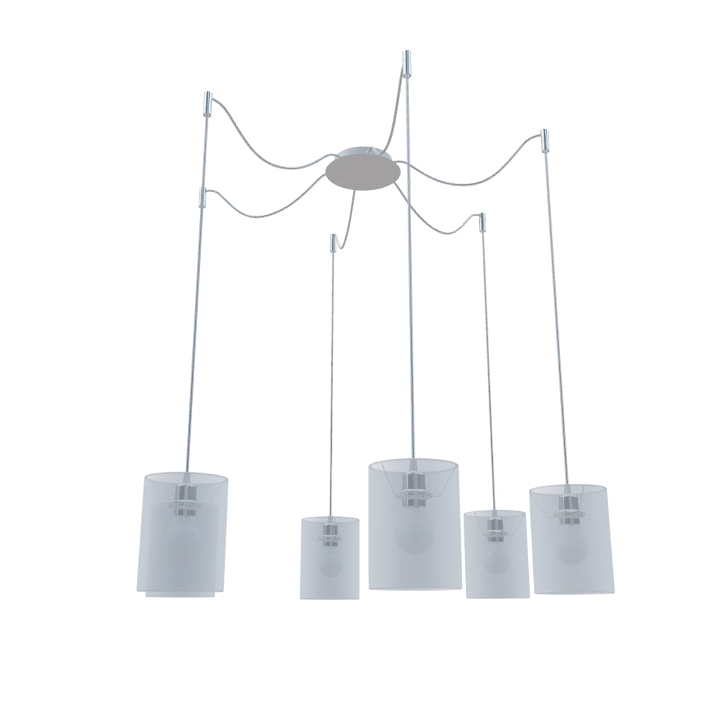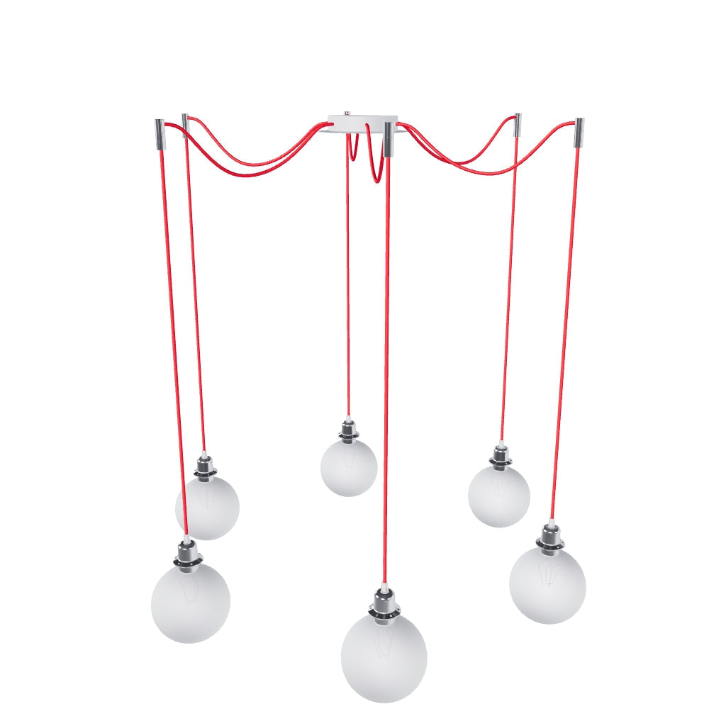 Pendelleuchte mit zentraler Deckenbasis und sechs Textilsarmen mit Metallsockel zur Deckenbefestigung, E27-Fassung zur Verwendung mit geeigneten Textilschirmen. Das Stoff-Pendelset wird mit vechromten Deckenhaltern geliefert, die in einem individuellen Abstand von der Basis installiert werden können. Kabellänge 3 m.