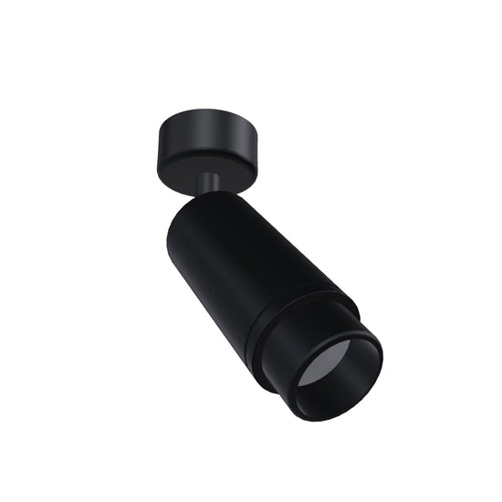 Zylinderförmige Deckenleuchte mit Anpassungsmöglichkeit des Lichtkegels durch ein Zoom System 10-50°. Die Leuchte ist für LED Lichtquellen mit einem GU10-Fassung geeignet. Benutzen sie Lichtquellen mit einem Abstrahlwinkel von 120°, um ungewünschte Schatten zu verhindern.