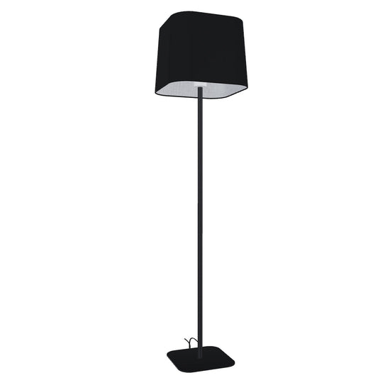 Stehleuchte mit quadratischem Textilschirm und Metallbasis.