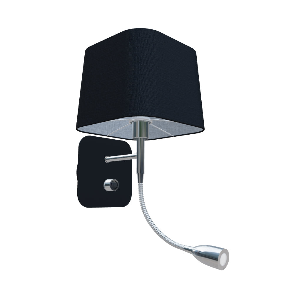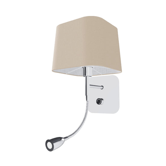 Wandleuchte mit quadratischem Textilschirm, ergänzt durch einen flexiblen Arm mit LED-Reflektor. Die Leuchte verfügt über zwei Lichtquellen, die separat über einen Drehschalter an der quadratischen Basis der Leuchte gesteuert werden können.