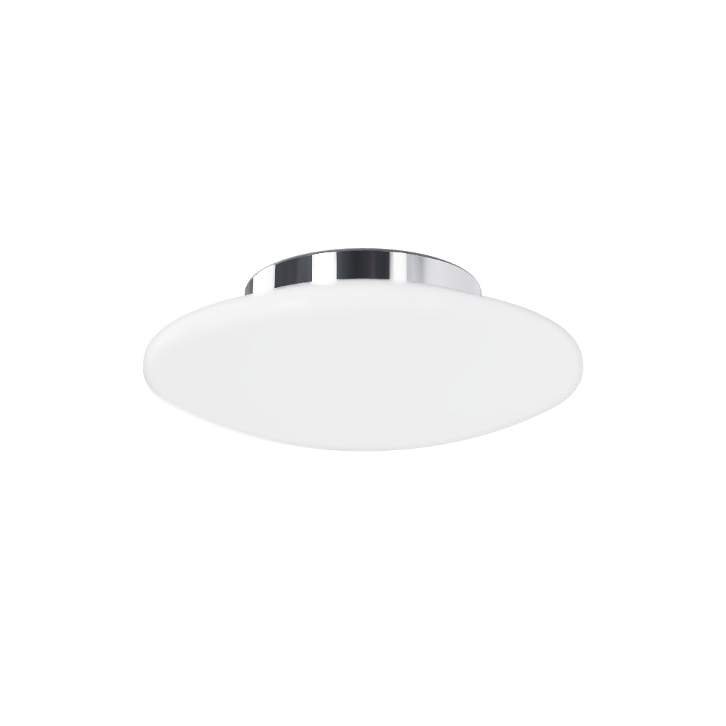LED-Deckenleuchte aus Opalglas auf Chrombasis für feuchte Umgebungen.