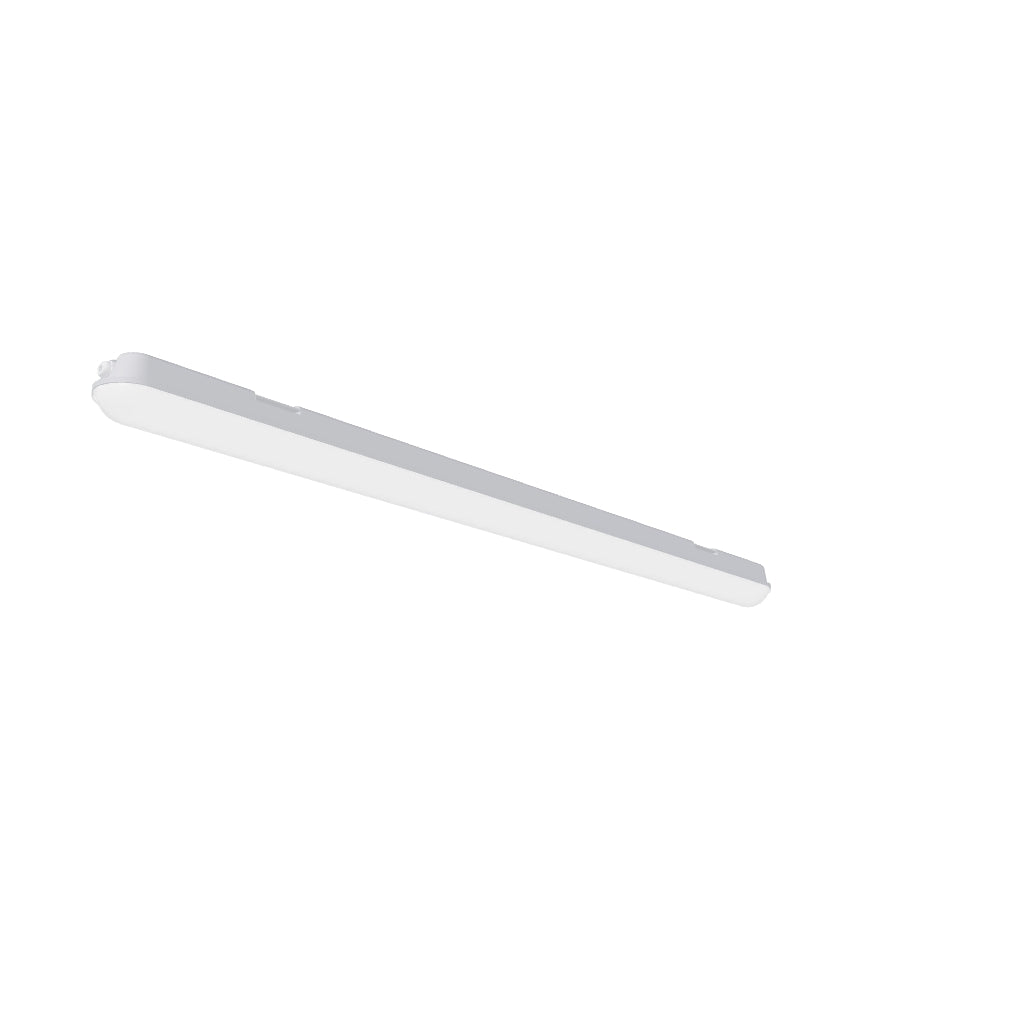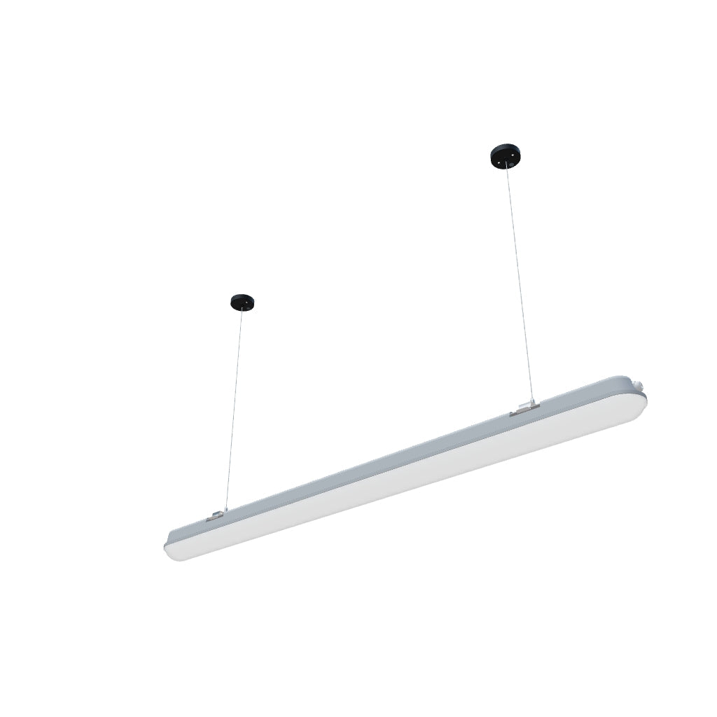 Industrielle lineare LED-Leuchte zur Deckenmontage oder Deckenaufhängung mit dem G13672-Set. Hohe Leistung und IP65-Schutz. Lieferung ohne Aufhängungssatz und Netzkabel. Mehrere Leuchten können in Reihe geschaltet werden.