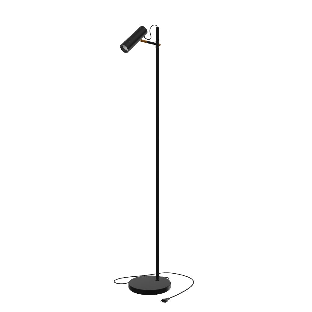 Elegante Stehleuchte mit zylindrischem Kopf für GU10-LED-Leuchtmittel. Der Schalter befindet sich auf der Rückseite des Leuchtenkopfs.